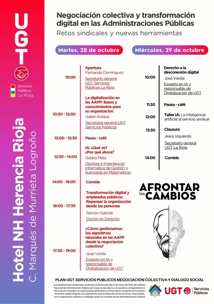 🤖 UGT Servicios Públicos La Rioja celebrará los próximos días 28 y 29 de octubre de 2025 las jornadas de formación «Negociación Colectiva y Transformación Digital en las Administraciones Públicas», dirigida a delegadas y delegados del sindicato.