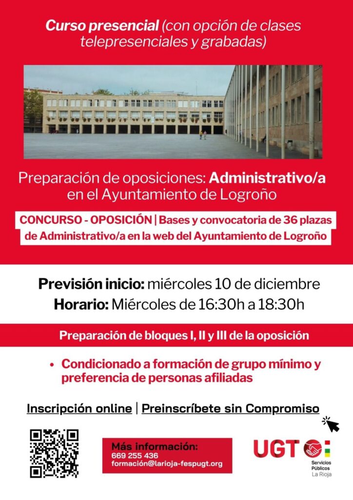 📚✨ UGT Servicios Públicos La Rioja pone en marcha la mejor preparación para las oposiciones de Administrativo/a del Ayuntamiento de Logroño.