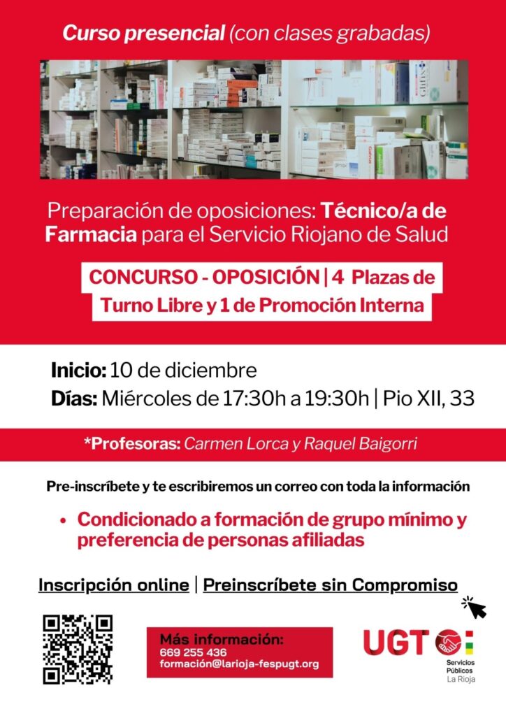 📚 UGT Servicios Públicos La Rioja prepara tus oposiciones de Técnico/a de Farmacia para el Servicio Riojano de Salud.